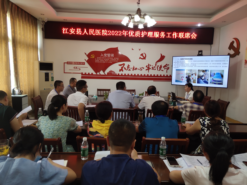 为推进我院优质护理服务工作有续开展,护理部于8月25日组织召开了2022年优质护理服务工作联席会,会议由护理部主任陈红宇主持,江安县人民医疗健康集团医院党委书记,院长、党委副书记瞿泽祥、纪委书记李正云、副院长陈能亮、朱建军、总会计师王兰钢出席会议,相关职能科室负责人、内外科片区护士长等20余人参加了会议。 会上,陈主任对2022年优质护理服务工作进行汇报,详细汇报了优质护理系列措施、优质护理服务取得成效及下一步优质护理服务工作计划。接着,陈主任就护理部调研临床科室在开展优质护理服务工作中存在的需各部门协调解决的问
