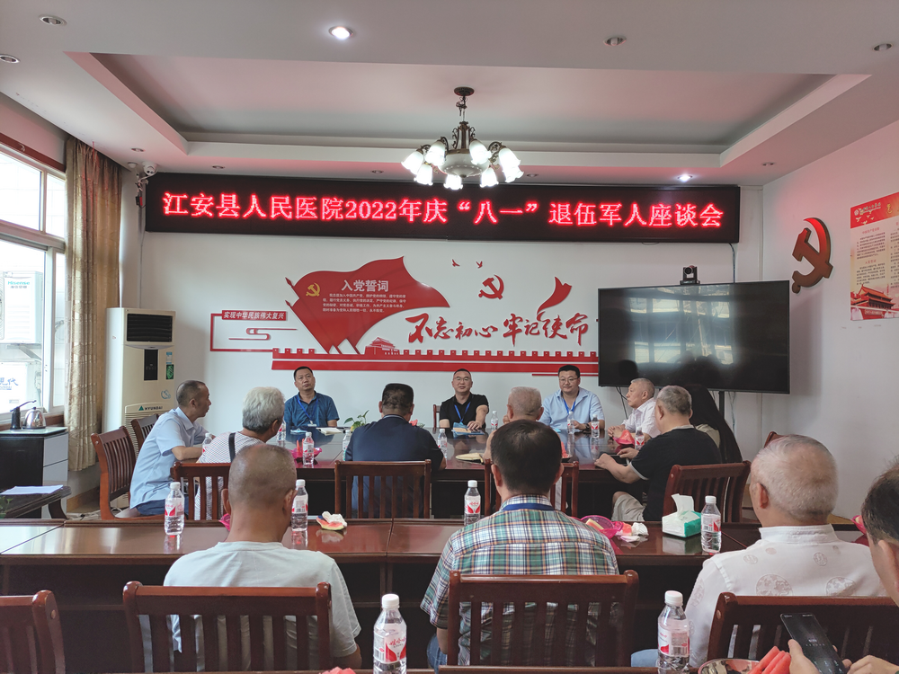 2022年7月29日下午,由人力资源中心组织,副院长肖洪住持开展退役军人及现役军人家属座谈会,党委书记邹刚、纪委书记李正云出席会议。 2022年是建军95周年,到场的退役军人及现役军人家属20余人。本次座谈会主要是对退役军人及现役军人家属表示慰问及感谢,同时学习宣传“八一勋章”获得者杜富国、钱七虎、聂海胜等同志们的先进事迹。最后,由江安县人民医疗健康集团医院党委书记做总结,他表示:“要大力宣传和支持爱国拥军意识,优待退役军人和现役军人。同时,希望我们退役军人及现役军人也要一马当先,时刻牢记自己的使命,在新时代中国特